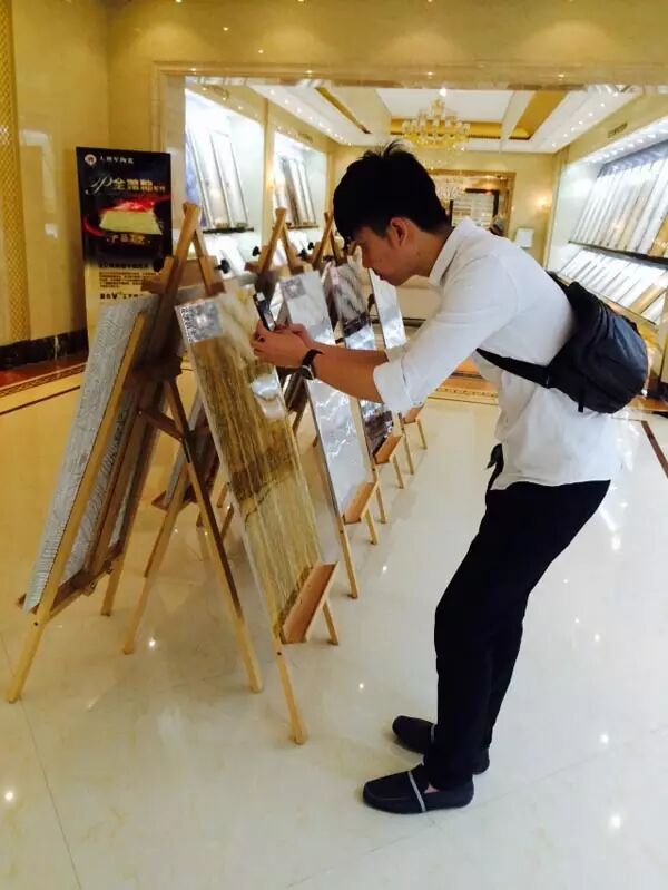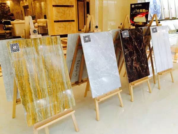 客户驻足于心怡的瓷砖前扫描二维码了解详细信息