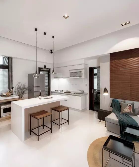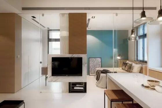 设计师将隔断全部打通,在方正的空间中重新规划。一半是生活区,一半是公共区域,卧室与书房、厨房与客厅的面积基本均等,看上去对称、顺眼。为了不浪费多余的卧室空间,在中间设置了一个衣柜,另一半用作书房,比墙体灵活许多,又可做丰富的装饰。玻璃拉门隔断非常干净,在小户型中有效的放大面积,提高空间亮度。软装的布置虽少却到位,突出了现代简约风格,几个抱枕与卧室的复古绿色墙壁还颇有些英伦风范。
